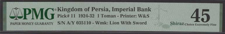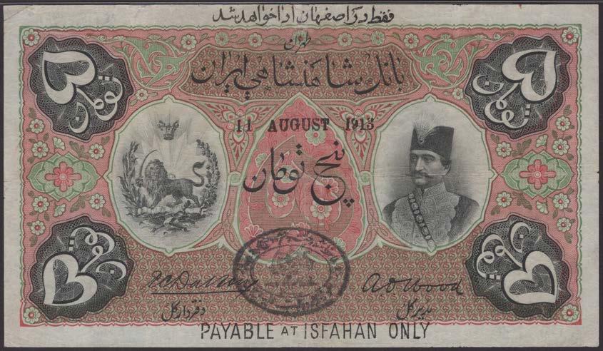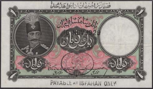 28 X IMPERIAL BANK OF PERSIA , 5 Tomans, Isfahan, 11 August 1913, black serial number R/A 055726, Dalton and Wood signatures, minor repairs, in PMG holder 20, very ne, a handsome example and a rare issue location