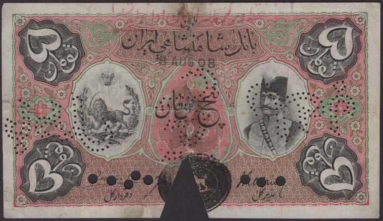 IMPERIAL BANK OF PERSIA , cancelled 5 Tomans, Kermanshah, 8 August 1908, serial number D/B 057275, Grundy and Rabino signatures, repaired, split and rejoined, cancelled, in PMG holder 15 NET, ne, rare to nd these o cial cancellations on the market as they were supposed to be destroyed, a rare branch of issue regardless of cancellation BNB B105e14, Pick 3