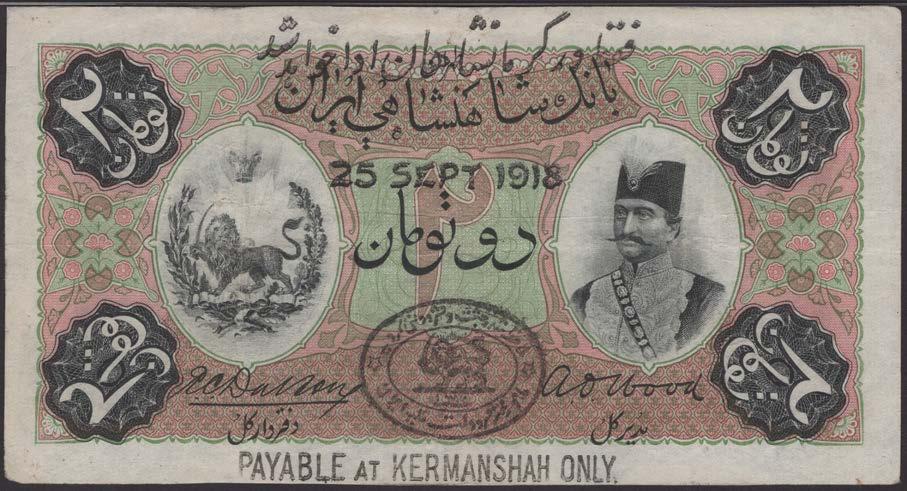 12 X IMPERIAL BANK OF PERSIA , 2 Tomans, Kermanshah, 25 September 1918, black serial number P/B 083233, Dalton and Wood signatures, repaired, but with nice original paper, in PMG holder 25, very ne, a very fresh looking example BNB B103f14, Pick 2