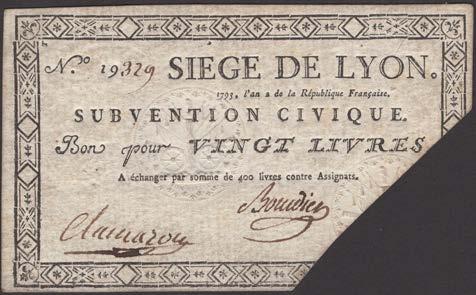 SIEGE OF MAYENCE , 20 Livres, rst issue, 1793, serial number 3416, hand-written on the reverse of a 10 Livres assignat of 1791, red handstamp and several manuscript signatures, but missing the usual signature of Herzog, edge tear, minor tape on reverse, about very ne and rare with a missing signature
