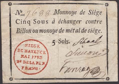 SIEGE OF MAYENCE , 5 Sous, second issue, May 1793, serial number 7688, three manuscript signatures, original paper and well embossed print, a couple of pinholes, good very ne and a lovely example, scarce
