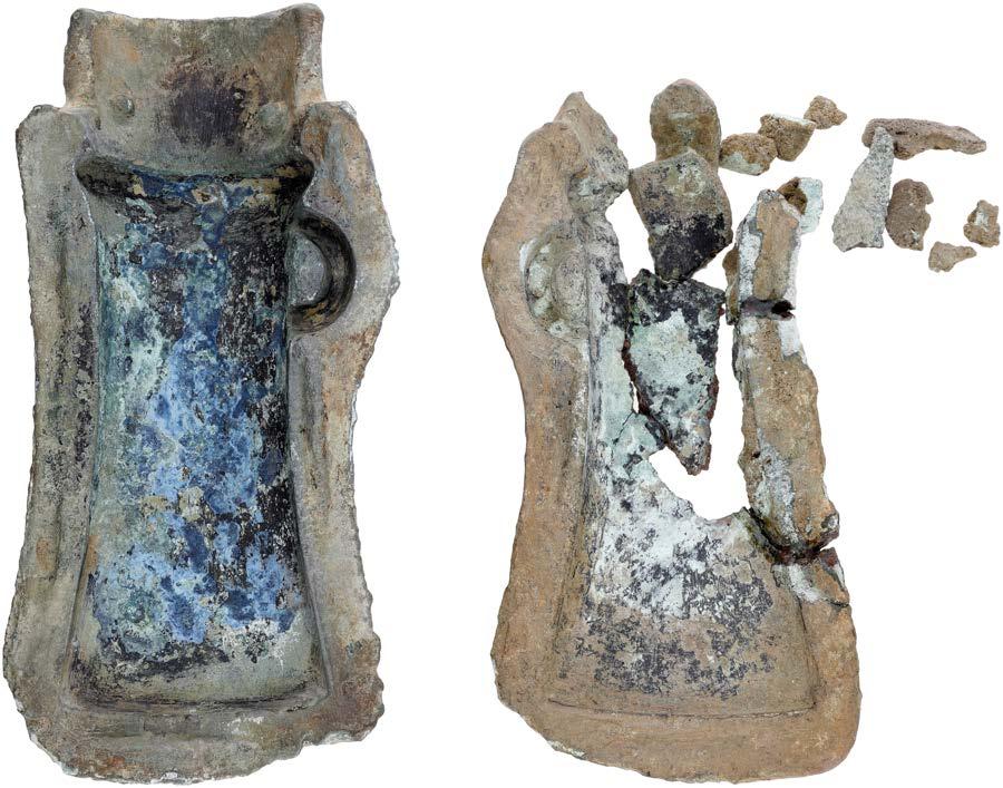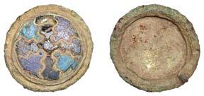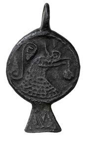 15th century, a lead ampulla, of "ask shape, with a "ower on one side and crowned letter on the other; together with 16th century lead bird seed holder, rounded front decorated with "owers around the rim and a "at back [2]. Both ne