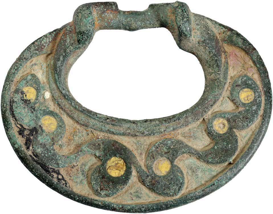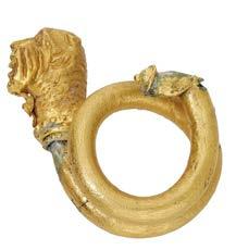 14thcentury,aminiaturechurchbrassfunereal #gureintheformofarecliningknight,measuring,8.5cmx4.7cm,hisleftarm akimbowithhisheadrestingonhisrighthand,lookingupwardswearingacoif,aroundhiswaistisasurcoat,hislegsarecrossed whichmightindicatehehadbeenonacrusade.Flatbackwithrivetholesateachendforattachment.Veryrareand newithan olive green patina £800-£1,000