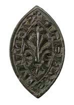 14thcentury,apointedovalbronzesealmatrix,measuring29mmx18mm,withoffsetsuspensionloopbehind;facewith centraldesignofa "eur-de-lis,withtwobirdsfacingeachother,reads+SIGILLVMSECRETI (secretseal). Aboutextremely newitha smooth green patina £60-£80