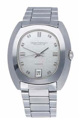 Dial: black, applied triangular, dot and baton indexes, magni ed date aperture, red and white dual time zone hand.