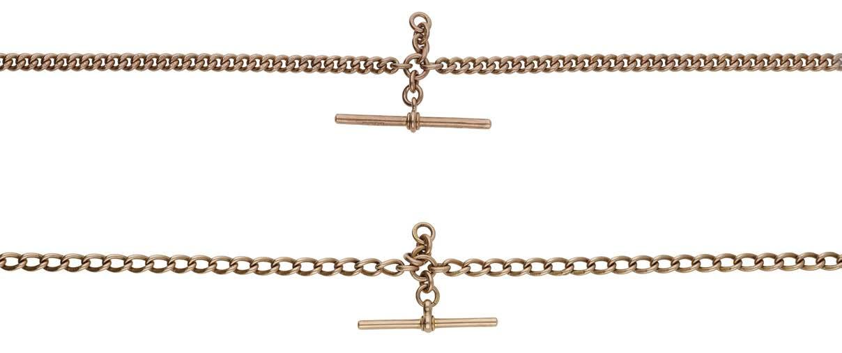 TWO GOLD ALBERT CHAINS, each fetter-link chain with T-bar tting and swivel clasps, stamped ‘9.375’, one chain with Birmingham assay mark, lengths approximately 34.5cm and 30.5cm respectively £900–£1,000
