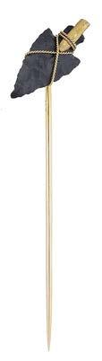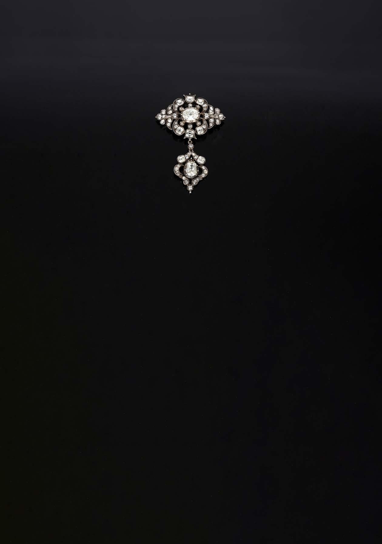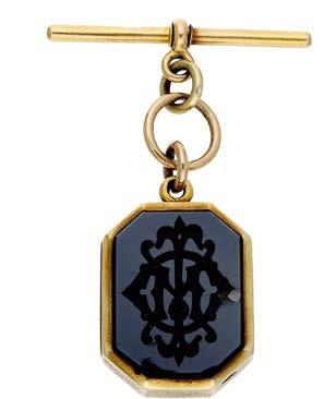 A 19TH CENTURY MEMORIAL BROOCH FOR HENRY ROXBY BENSON, the oval onyx panel applied with initials ‘H R B’, inset with rosecut diamonds, the reverse engraved with inscription ‘Henry Roxby Benson born Nov. 2. 1818. died Jan. 23.1892. M.F.B.’, mounted in gold, length 34mm. £300–£500