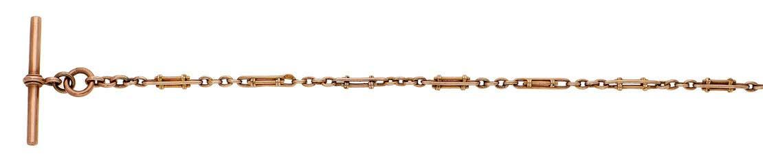 A 9CT GOLD ALBERT CHAIN, the fancy-link chain with T-bar tting and swivel clasp, stamped ‘9.375’ throughout, maker’s mark for John Grinsell & Sons, Birmingham, length approximately 33cm. £600–£700