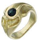 A MEDIEVAL GOLD SAPPHIRE STIRRUP RING, LATE 13TH/EARLY 14TH CENTURY, the hoop of D-shaped cross-section, with raised bezel inset at the apex with the original heart-shaped cabochon sapphire, the bezel with angled shoulders and attened on the opposing sides, tapering towards the base, diameter 20mm, width 2mm.