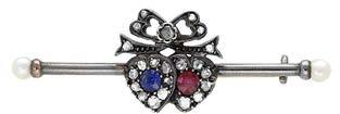 AN AMETHYST AND SEED PEARL BROOCH, CIRCA 1900, the openwork lozenge-shaped brooch set with a cushion-shaped amethyst with further amethysts to either side and seed pearl highlights, mounted in gold, stamped ‘585’, length 5cm. £300–£400