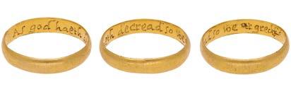 A GOLD POSY RING, EARLY 18TH CENTURY with plain exterior, the interior inscribed ‘As god hath decread so we agred’ in italic script, ring size W½. £500–£700