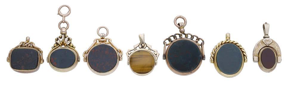 A HARDSTONE CAMEO CROSS PENDANT, CIRCA 1860, the six hardstone cameos carved to depict classical gures, possibly the Greek god Dionysus (centred) accompanied by a retinue of female followers, mounted in gold, pendant length 7cm. £500–£700