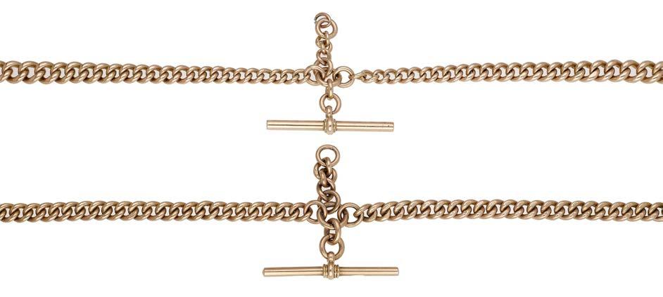 TWO ANTIQUE 9CT GOLD ALBERT CHAINS, the curblink chains with each with swivel clasps, both with T-bar tting, stamped ‘9.375’ throughout, Birmingham assay mark, lengths 40 and 42cm. £1,500–£1,800