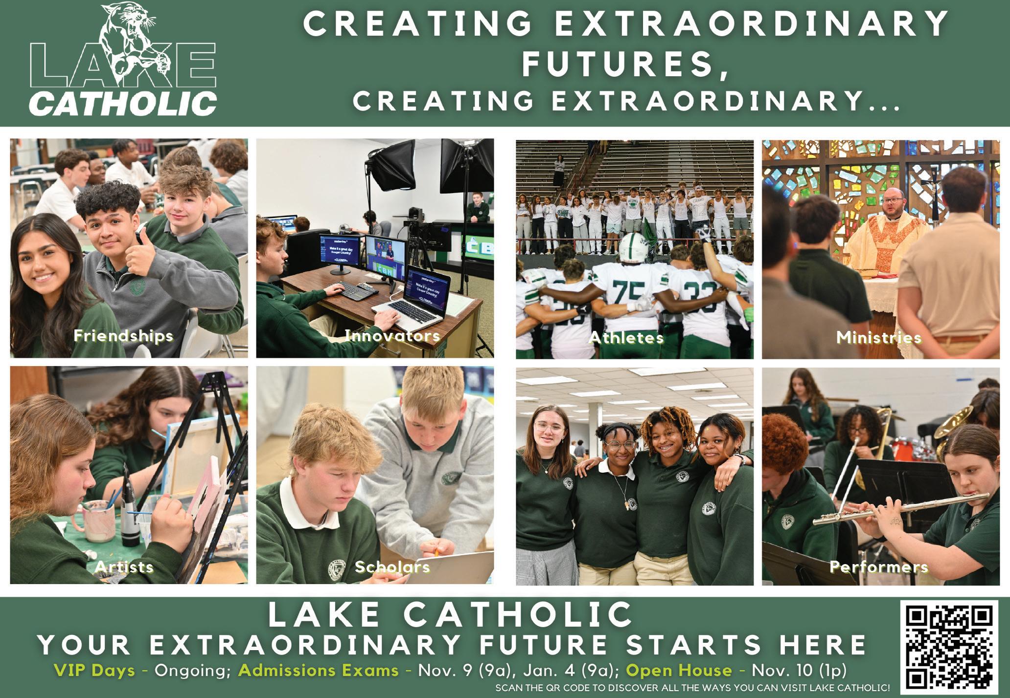 Life at Lake Catholic offers a transformative education grounded in faith, academic excellence, and community service. With a rigorous curriculum, diverse extracurricular activities, and a commitment to developing well-rounded individuals, students thrive in a supportive environment. The school’s dedicated faculty and staff foster personal growth and spiritual development, preparing graduates for success in life beyond high school. Come to Lake Catholic and discover all the ways you can create your extraordinary future. 440-578-1020, lakecatholic.org
