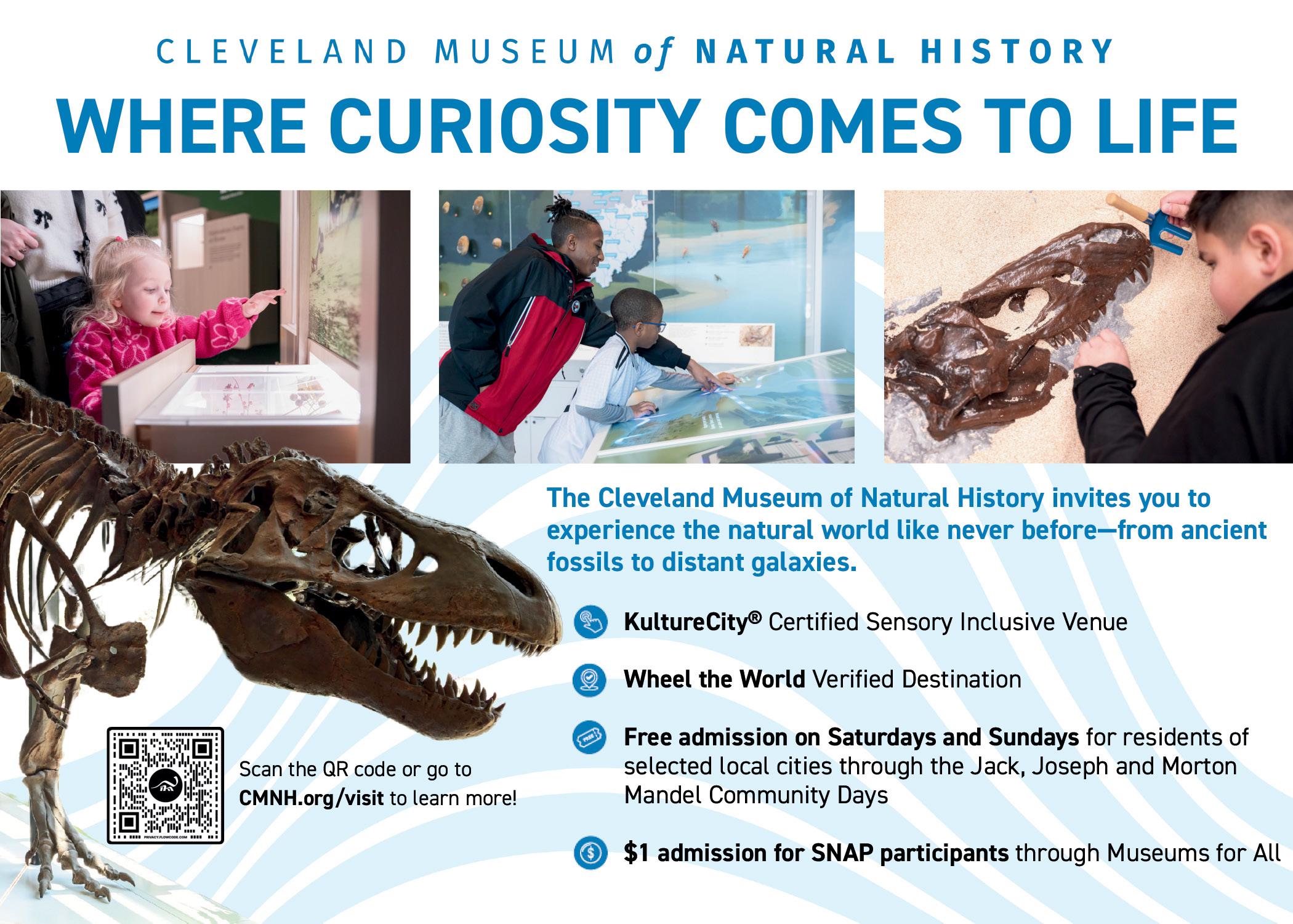 The Cleveland Museum of Natural History illuminates the world around us and inspires visitors to engage with the natural forces that shape their lives. Since its founding in 1920, the pioneered scientific research to advance knowledge across diverse used its outstanding collections, which encompass millions of artifacts and specimens, to deepen the public’s understanding of the dynamic connections between humans and nature. Through its Natural Areas Program, the Museum stewards more than 12,500 acres of protected ecosystems across northern Ohio. Visit cmnh.org