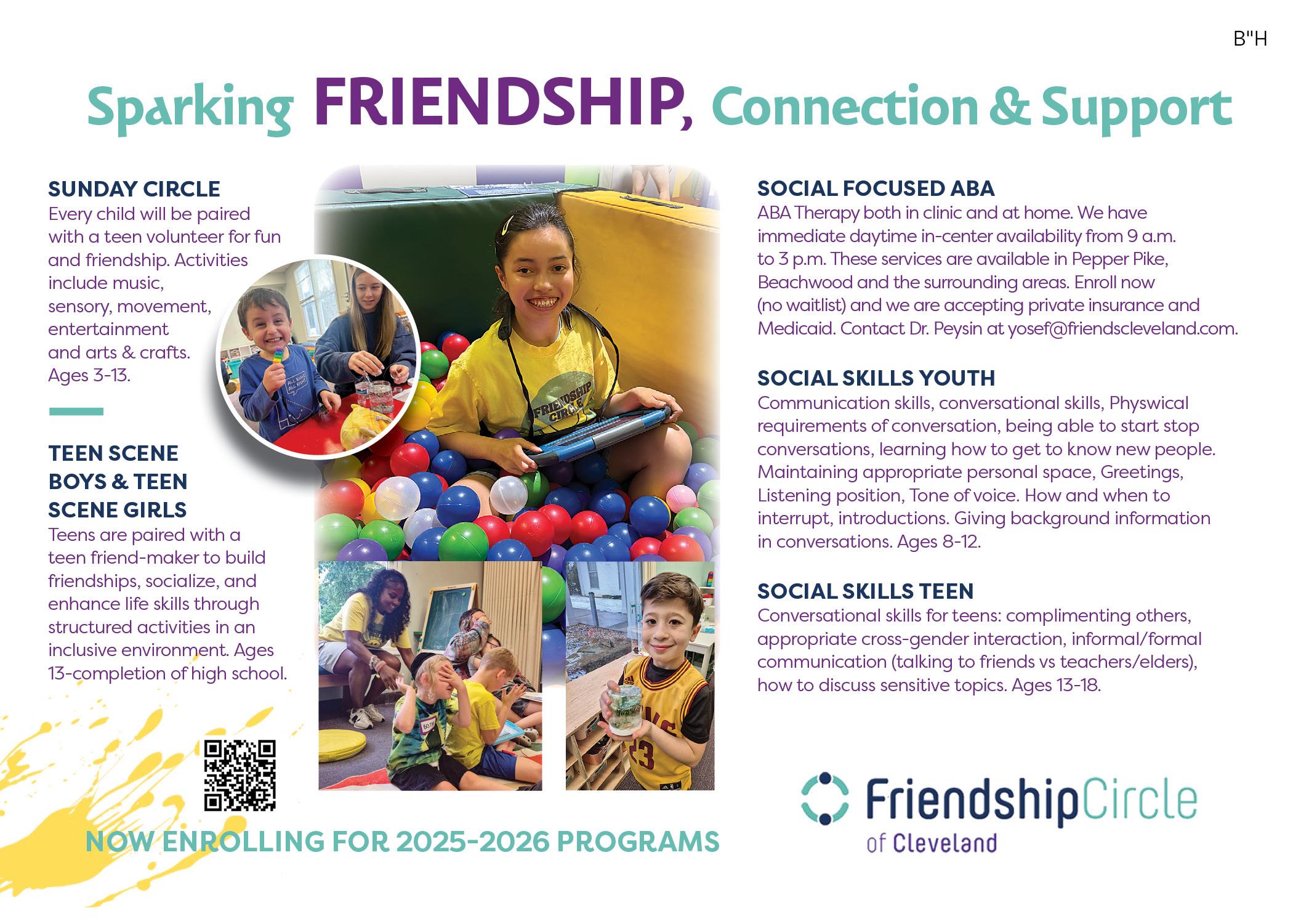 Friendship Circle sparks friendship, connection and support for children of all abilities, their families and teen volunteers. Children, teens and young adults with developmental disabilities are provided a unique opportunity to make friends and enhance their social skills through a variety of interactive programs alongside their peers. Teen volunteers are given an opportunity to experience joy and fulfillment from helping others, while also learning how they can help make the world more inclusive and accepting. Friendship Circle offers a safe place for these friendships to form organically, while also providing fun activities, field trips, community integration, holiday celebrations, family support, sensory stimulation and so much more. Every child deserves a friend. Contact chava@ friendscleveland.com, call 216-377-3000 or visit friendscleveland.com