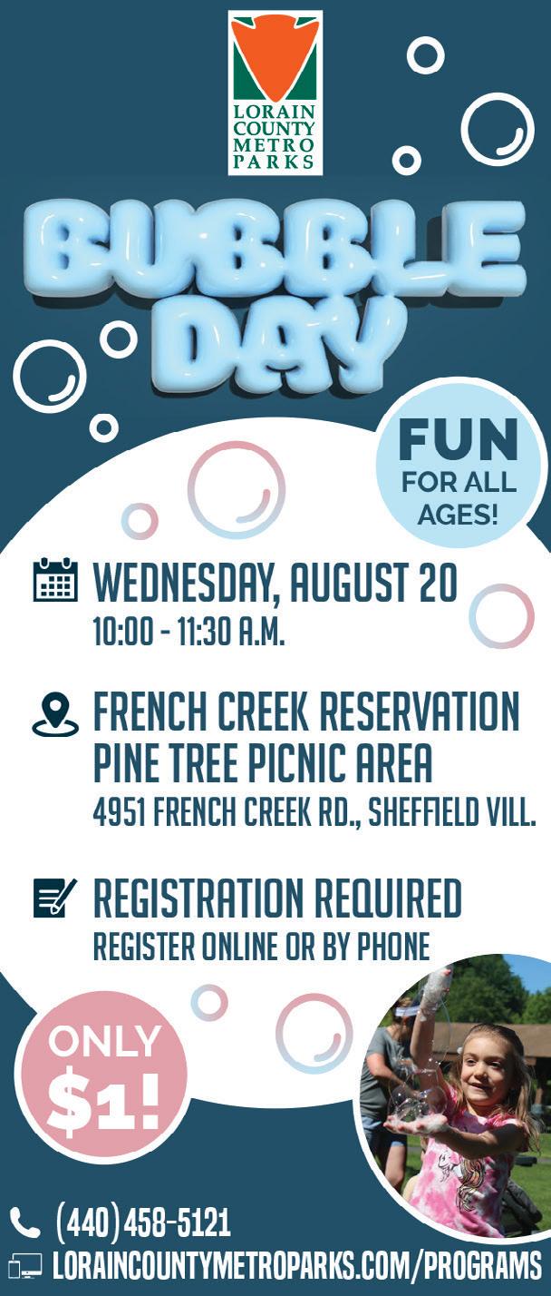 Bubble Day. Enjoy bubbles in all forms. From foam to bubble art, this program has a station for every kind of bubble! 10-11:30 a.m. French Creek Reservation, 4951 French Creek Road, Sheffield Village, loraincountymetroparks.com
