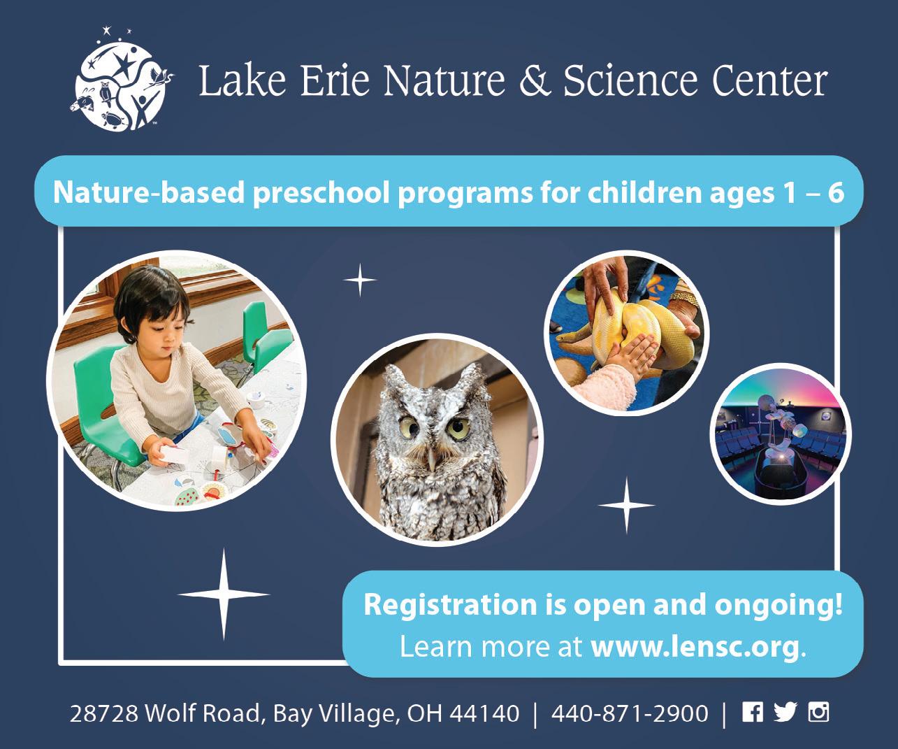 Frogs & Polliwogs. Hands-on activities, music, games and simple crafts. Ages 2-3 with an adult. 9:30 or 11 a.m. Monday-Wednesday, and 9:30 a.m. Thursday. Lake Erie Nature & Science Center, 28728 Wolf Road, Bay Village, lensc.org