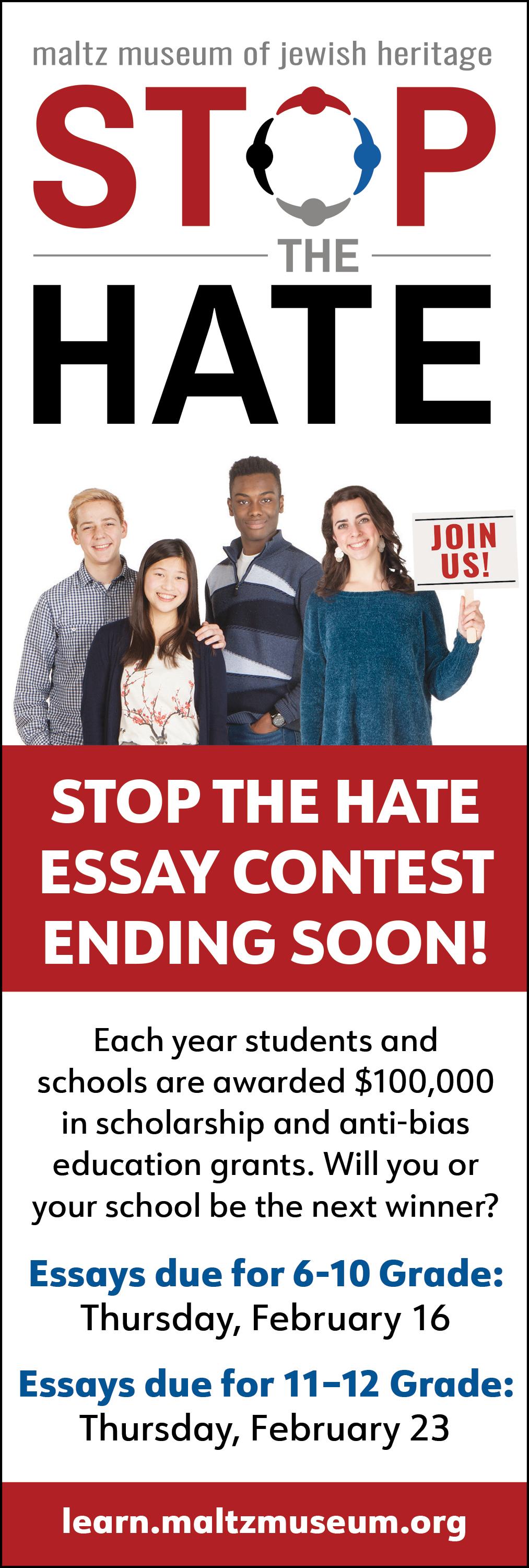 The 15th Annual Stop the Hate: ® Youth Speak Out essay contest and Youth Sing Out song writing contest celebrates students committed to creating a more accepting, inclusive society. Each year, through the generosity of a donor, the Maltz Museum awards $100,000 in scholarships and anti-bias education grants in recognition of 6–12th grade upstanders. Will you or your school be the next winner?