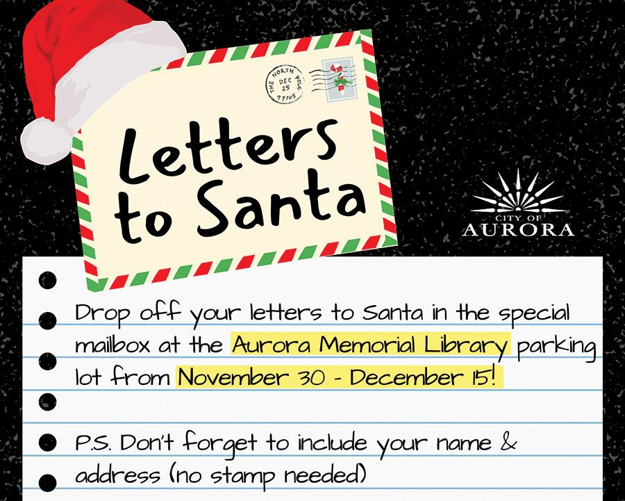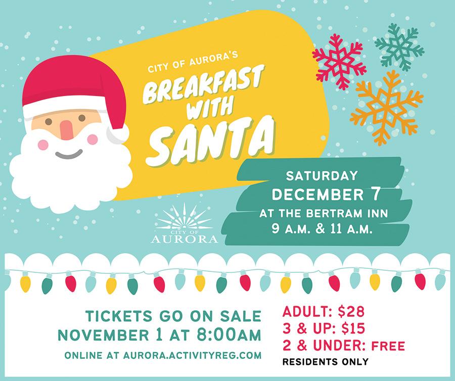 Letters to Santa can be dropped off beginning November 30 at the special mailbox located at the library until December 15. Breakfast with Santa occurs on Saturday, December 7 at The Bertram Inn, with two seatings at 9 a.m. and 11:00 a.m. You can sign up at aurora.sctivityreg.com beginning November 1. This is a popular event, so sign up early!