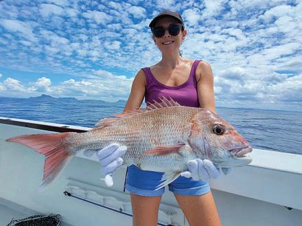 Meanwhile,Vanessahasbroughtinapretty, frillybrightorangeseaperch,which,asis customwiththefirstfishoftheday,shethrows back…justasabeautifulcolouremerges belowthesurfacebeforeme.I’vecaughttwo goldensnapper,Lukedeclares.Thesefishare sovibrant,theylookliketheyshouldresidein anaquarium.Butitturnsoutthereareplenty morewheretheycamefromasMaria’sline becomesactiveandshesubsequentlyreelsina decent-sizedsnapper