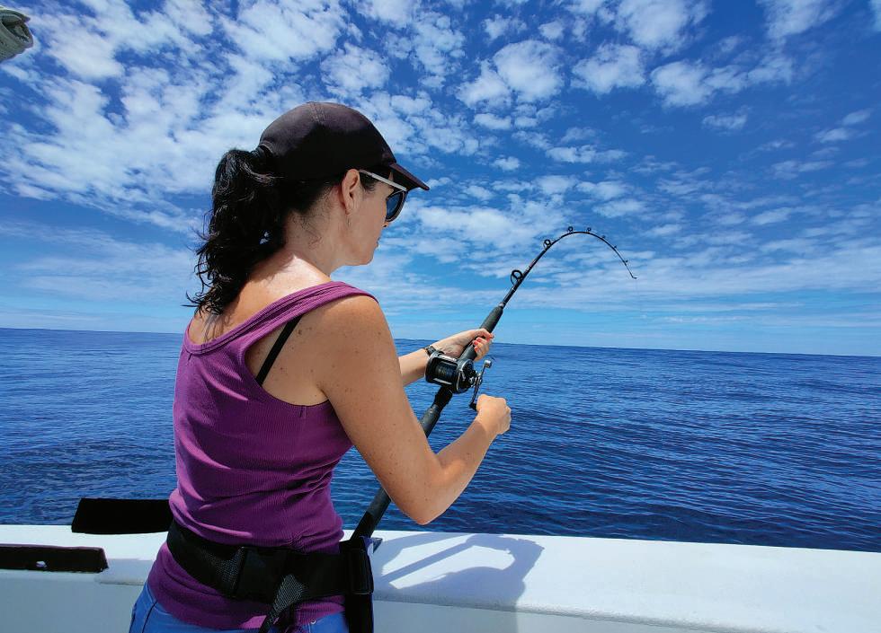 Itdoesn’ttakelongtogettired–not lethargyfromseasicknessbutaphysicaltire, andLukehelpfullyfastensaGimbalbeltforme toplacetherodwhileIwindandwind,silently prayingIdon’tgetanotherwaveofnauseaand havetoabandonrodinthemidstofmybig moment.Hecoachesmeonliftingtherodwith theriseinswellbeforeloweringitandwinding andIdothisforseveralminutesbeforealargish massofsilverappearsbelowsurface.I’dcaught abigdaddysnapper!