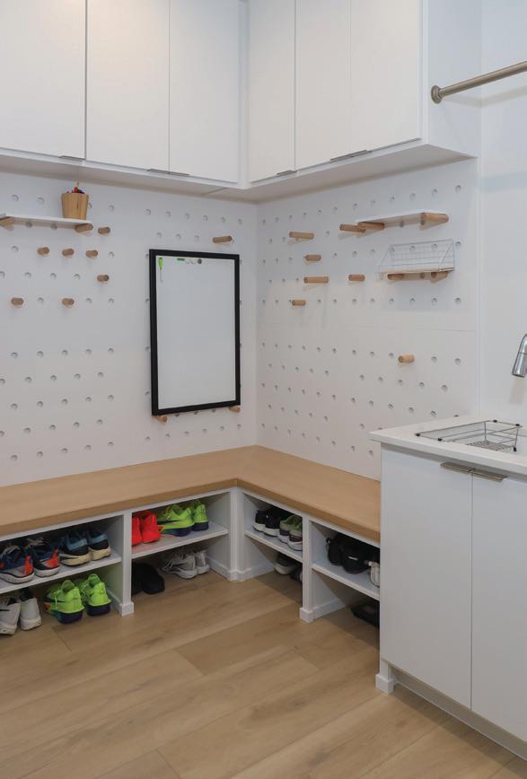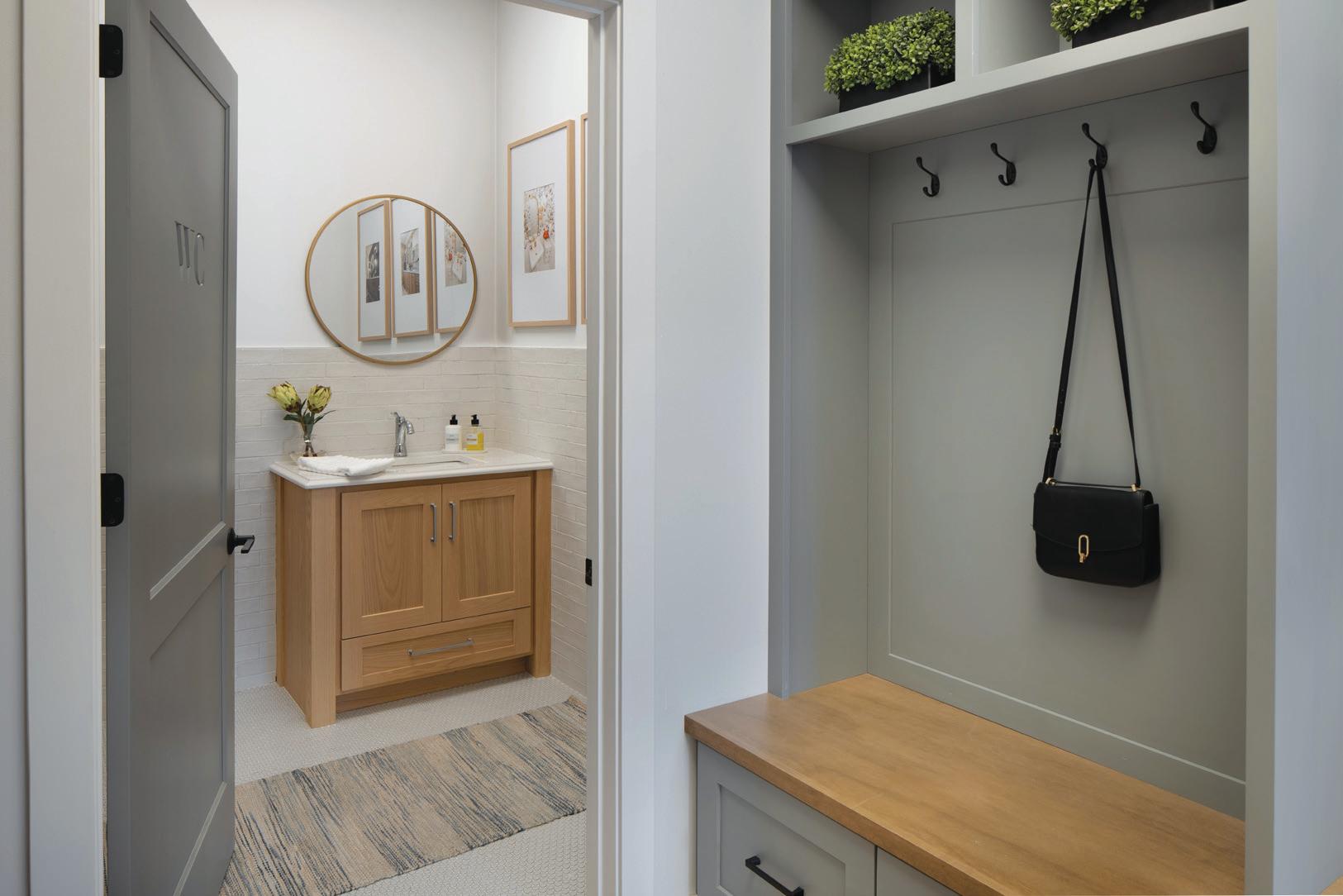 Around the corner in the bathroom, Wendt demonstrates a custom door monogram leading to a Red Oak Boho-stained vanity and Calico White Quartz, with an Ogee edge and rectangle undermount sink from Spaulding Stone. In the adjacent mudroom is another custom-painted cabinetry design with CNC cut-outs.