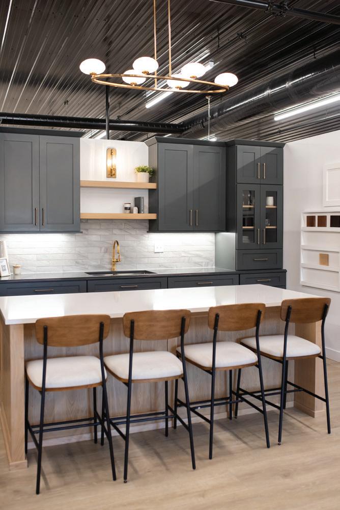 To showcase contrasting palettes with their favorite cabinetry styles and countertops, both of the offices deliver a distinctly different style. Kaeli and Jordan’s office has a moody vibe with modern and sleek features, including a perimeter snack bar with a mini sink and microwave drawer. Here, Kaeli chose to bring the drama with a painted cabinet in Iron Ore. Jordan installed all of the showroom’s tile, including this office’s bold black and white backsplash. Their design also features glass doors, interior stained and lit cabinets, and a maple-stained shelf, all accented by the glow of a Midcentury modern sconce and globe pendants from Visual Comfort & Co. While many of their island or peninsula designs feature legs or posts, this one shows extended side panels that enclose the snack-bar. The offices, breakroom, and studio feature bar stools at work, all available through the new Wendt Goods line.