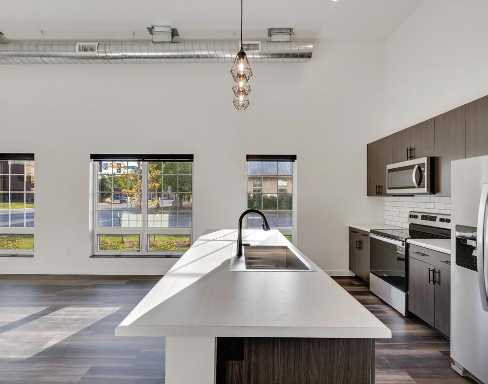 Inside Mercantile’s sixth-floor studio are 12-foot ceilings, quartz countertops, and Midwest-made cabinets from Smart Cabinetry. The bedroom features stunning