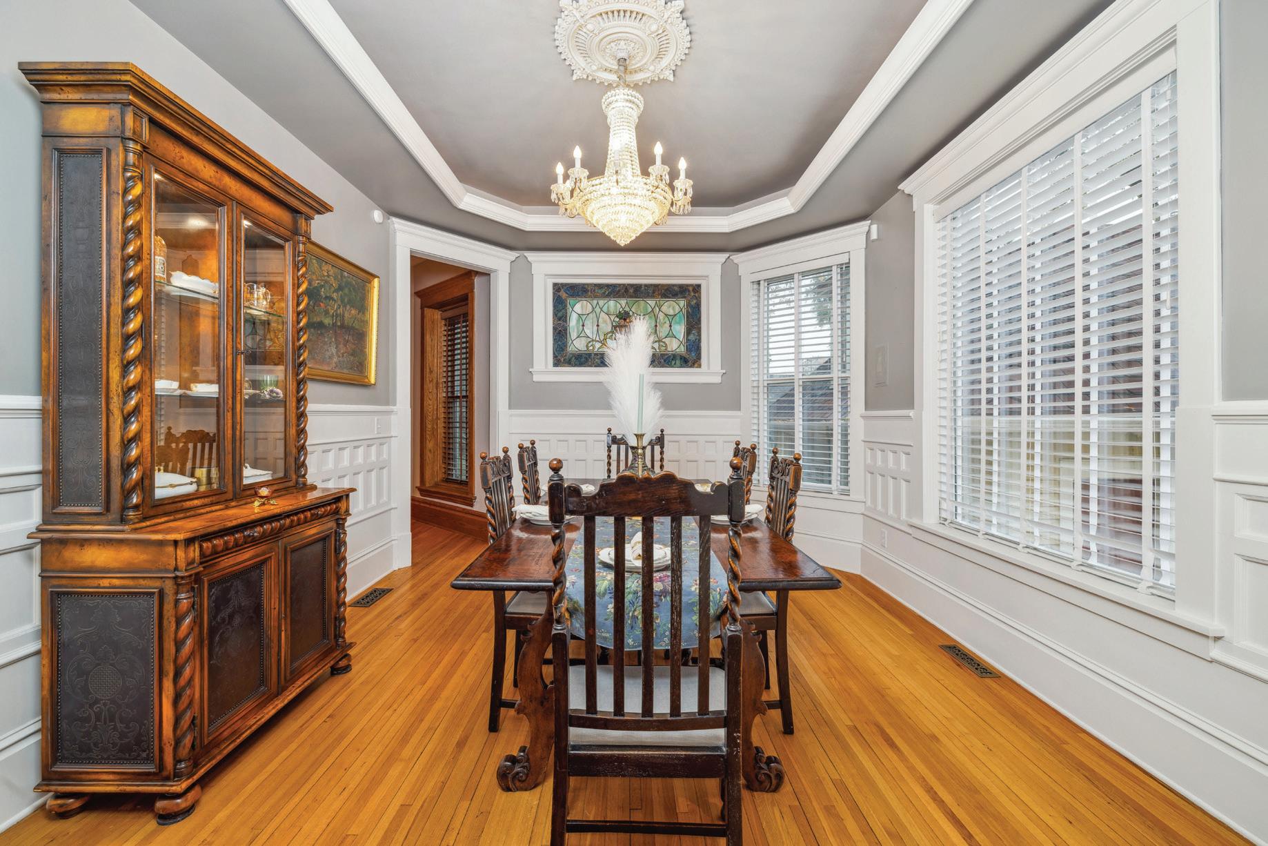 In this street-level entertaining space, Jenna preserved the original tin ceiling tile, added wainscoting details, and worked with Weyer Companies to refresh the entire first floor in an elegant Sherwin-Williams Westhighland White. The Stone building's original first-floor bank safe was also repurposed as secure bar and supply storage.