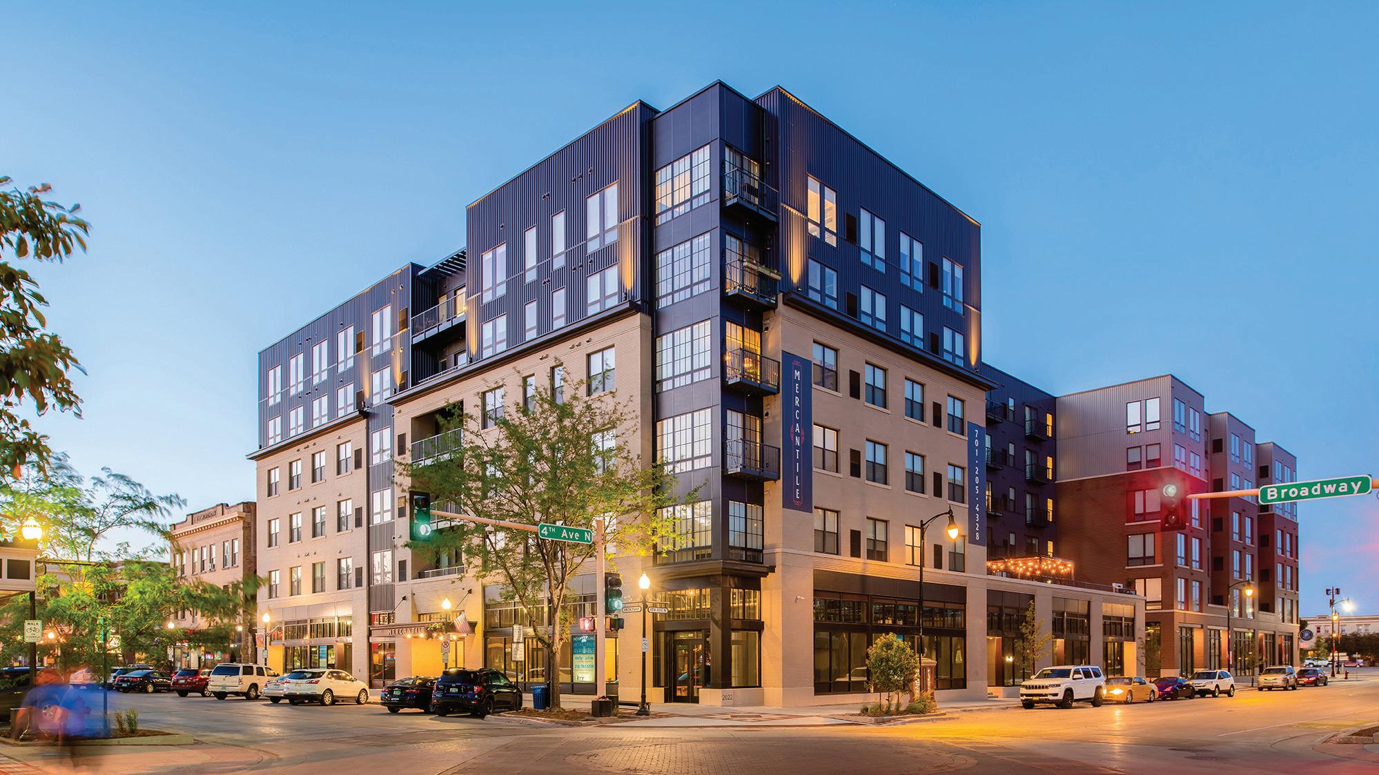 Since downtown’s Fargo Mercantile Co. was demolished in 1966, its wholesale grocer site has hosted Goodyear Service Center’s 1968 garage, a pop-up food truck park, a theater, an art gallery, and the Red River Market. In 2022, JLG and Kilbourne Group gave this versatile corner new life with Mercantile, a six-floor lifestyle living center overlooking Broadway. Mercantile reactivates the site with nostalgic opulence and modern amenities for walkable residential, including an automated parking ramp, a rooftop patio and well-appointed community room, pet wash stations, bike storage, floor-to-ceiling windows, and premium retail space for streetside services.