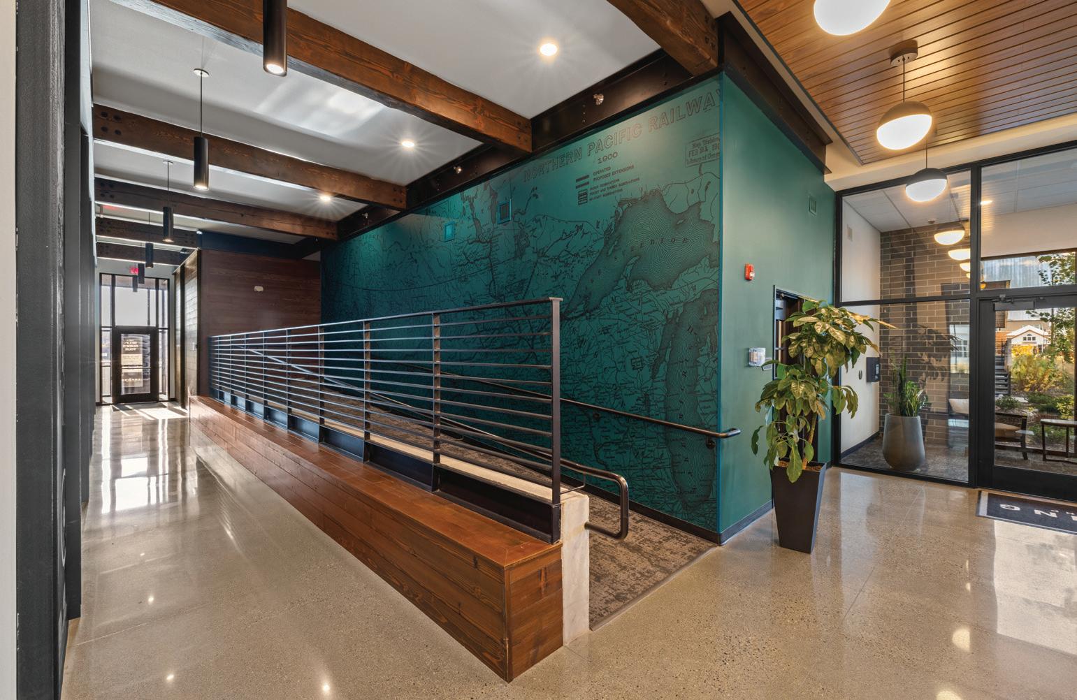 “The graphic on the opposite wall is an old image of one of the Northern Pacific’s rail engine cars,” explained Arroyo. “We used NDSU’s archives to gain access to this image, then worked with the same manufacturer, correctly pixelating it to fit this entire wall expanse. Throughout, we incorporated a lot of industrial and raw materials, including reclaimed wood, metal, and concrete. We also have exposed I-beams and a reclaimed bench using the same wood as the ceiling beams.” Just through the glass within the lobby is a vacant space that