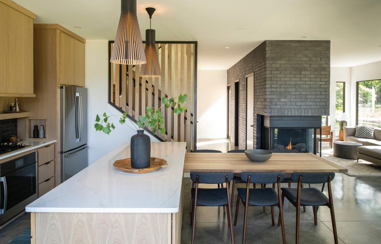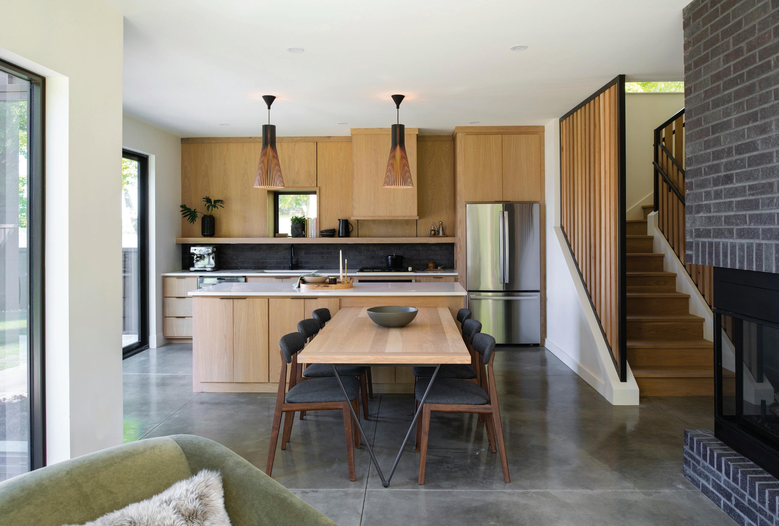Another area designed to efficiently adapt is the cozy ground level with durable concrete flooring, featuring a full kitchen with an expandable dining space. Here, Craftwell chose modern lines in white oak cabinetry built by Paul Allen, with clean detailing and simple white Quartz countertops.