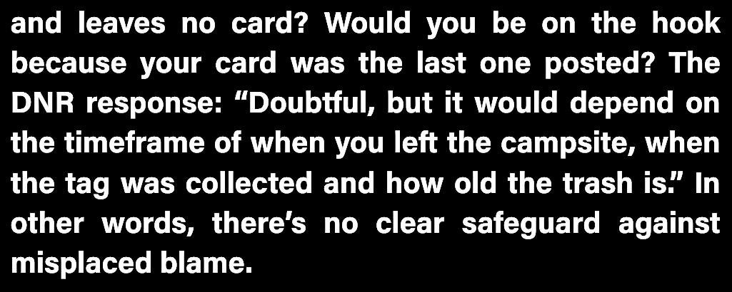 2. Post this card prominently at the campsite before making camp and leave posted upon departure when camping on State-owned land other than State Parks, Recreation Areas, State Forest Campgrounds or State Game Area Campgrounds DO NOT post on a motor home, camper or trailer or nail the card into trees.