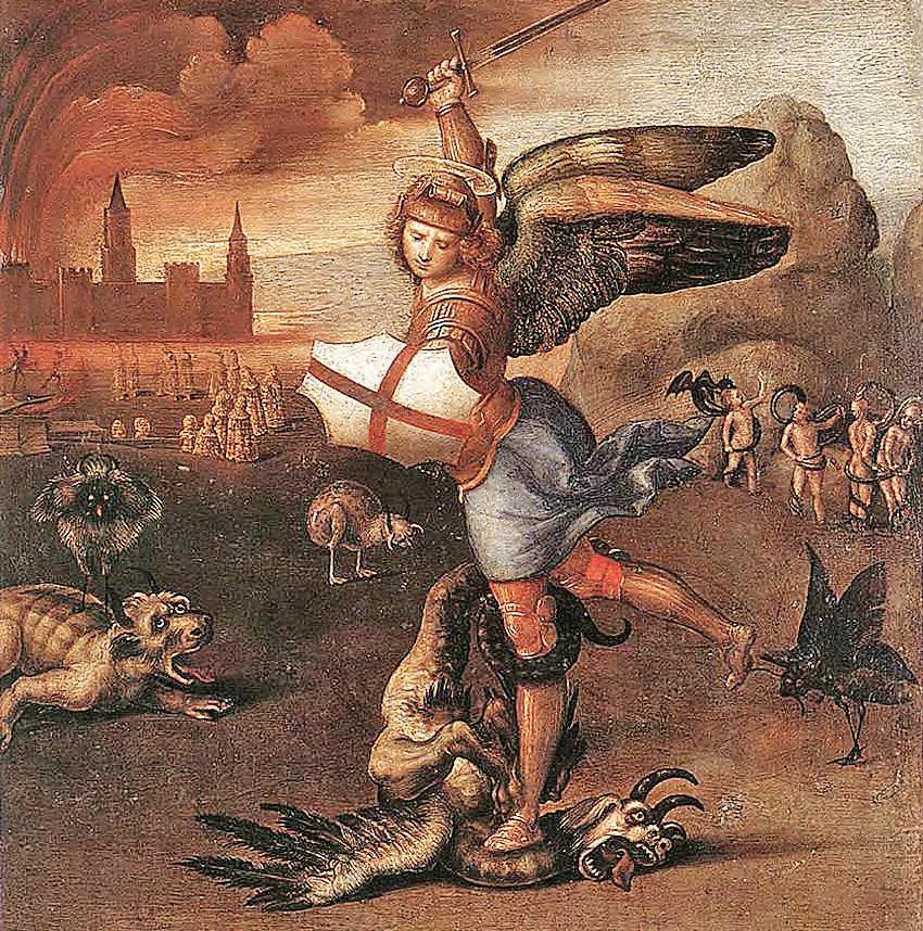 “Saint Michael Vanquishing Satan” by Raphael (1503) is a painting in the collection of The Louvre in Paris.