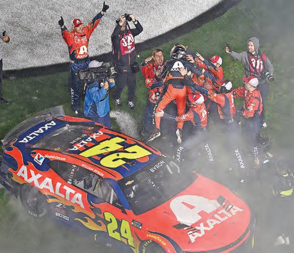 NASCAR Hall of Fame driver Richard Petty and President Donald Trump and greet each other before the Cup Series’ season-opening Daytona 500 on Sunday. William Byron won “The Great American Race” for the second straight year. See more in Sports.