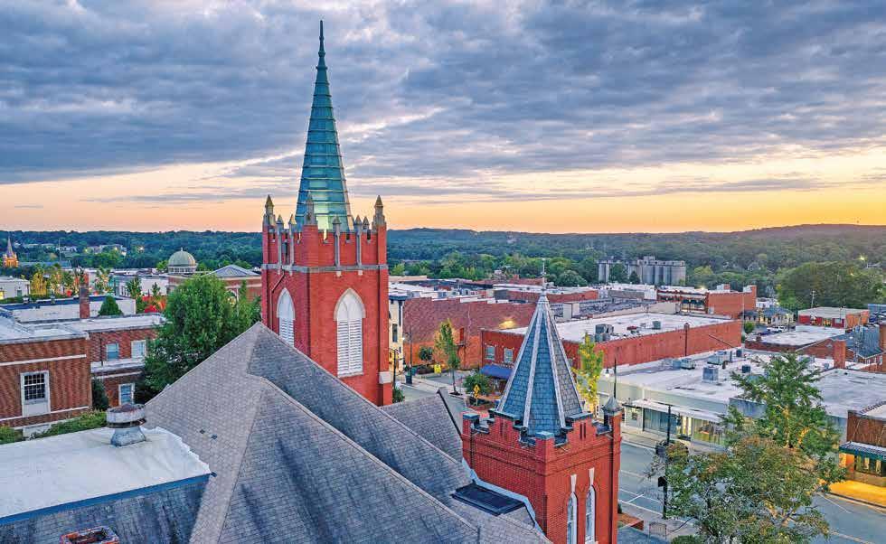 Central Methodist Church’s distinctive copper-green spire and Gothic Revival towers stand against a painted sky last week in Albemarle.