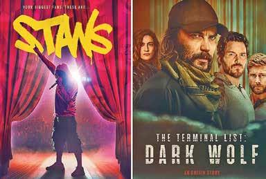 “Stans,” a documentary about a cast of superfans of Eminem, left, and the series “The Terminal List: Dark Wolf,” right, are streaming this week.
