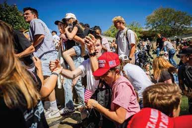 Charlie Kirk hands out hats before speaking at Utah Valley University in Orem, Utah, Wednesday, Sept. 10, 2025.