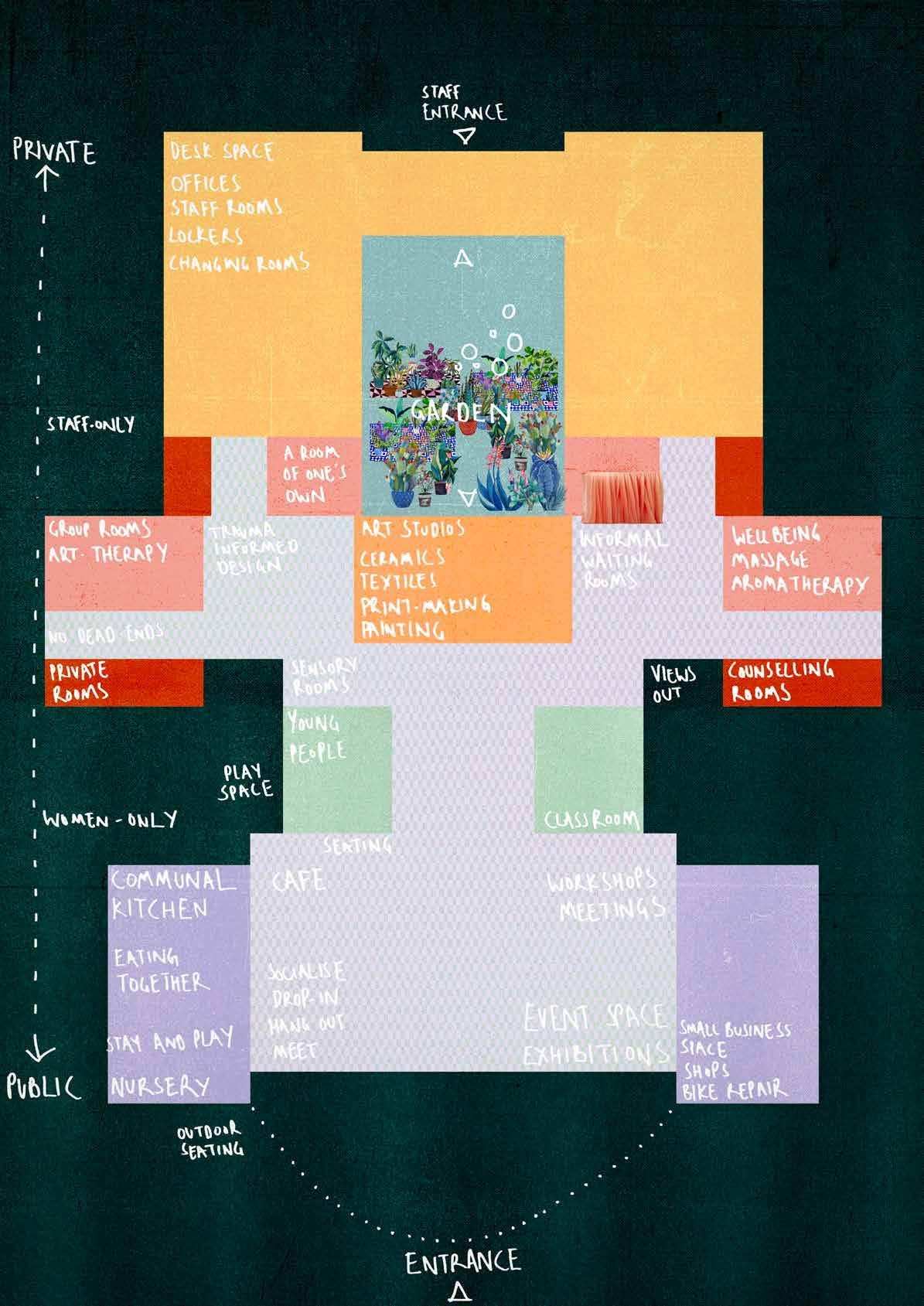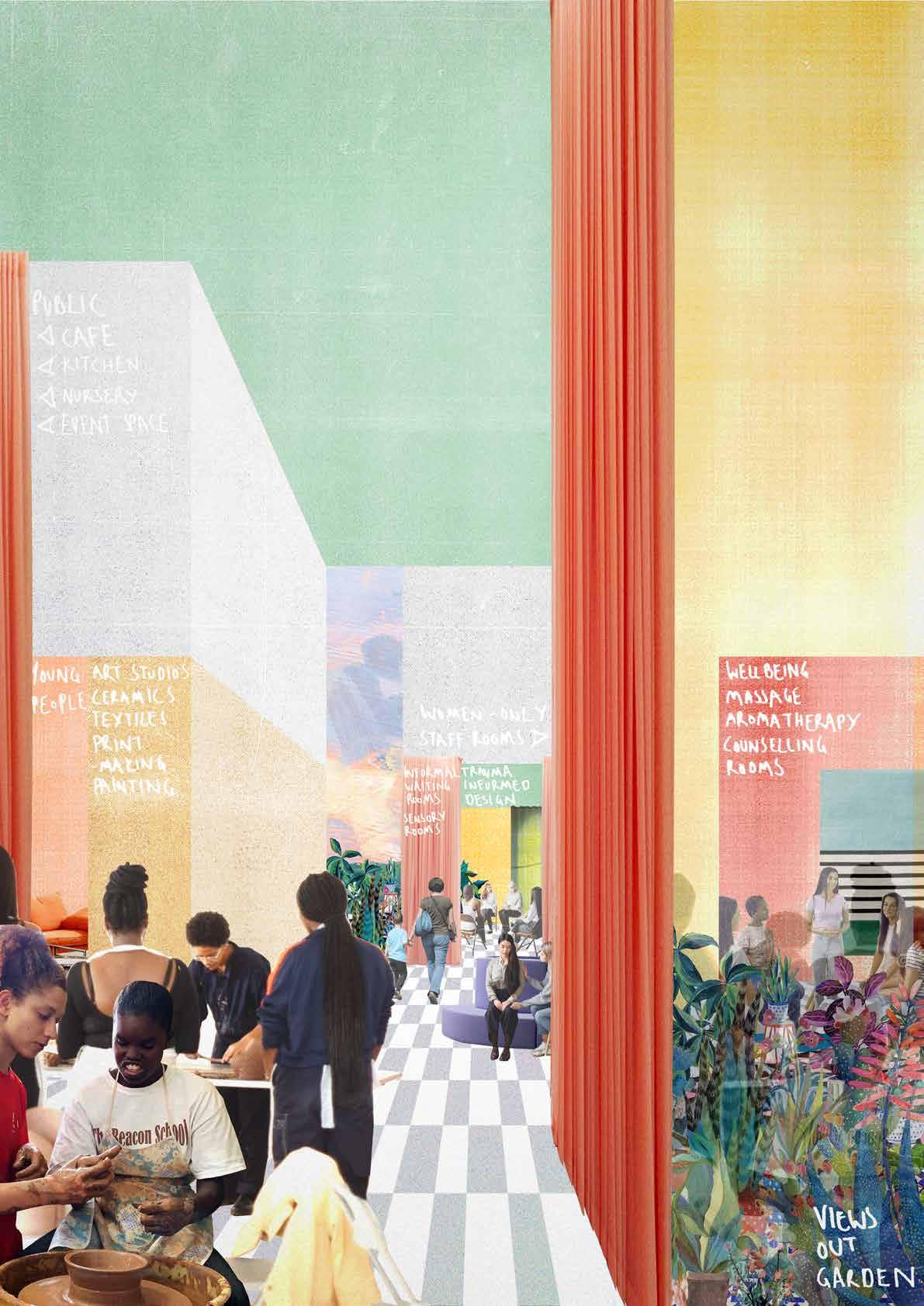 A range of uses from public cafes, shared kitchens, workspaces and small-business units, art studios, a gallery and event space, space for young women and a creche will complement the services. This will reduce the stigma associated with accessing certain services. A trauma-informed design approach will develop bespoke, non-institutional spaces where there is space for everyone to feel safe.