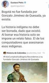 LEYENDA NEGRA. A la izquierda grabado anónimo de origen flamenco de en torno a 1570, en el que se ve al duque de Alba devorando a un niño. Lejos de lo que podría pensarse, la Leyenda Negra contra el legado hispánico, sobre todo en América, sigue estando más vigente que nunca. Arriba, difusión de propaganda antihispana desde el cine. A la derecha un influente en redes parafraseando un libro de Eduardo Galdeano del que después renegó. Sobre estas líneas escuela de Florida (Estados Unidos) donde se enseña a los niños a odiar el legado hispánico relacionando la conquista de América con todos los tópicos propagandísticos de la Leyenda Negra. La denuncia de la asociación hispanista Héroes de Cavite hizo retirar la campaña. A la derecha post hispanófobo del presidente de Colombia sobre la fundación de Santa Fé de Bogotá, en la línea de los gobernantes de toda Hispanoamérica: el relato del paraíso indígena destruido por la llegada de los españoles hace 500 años.