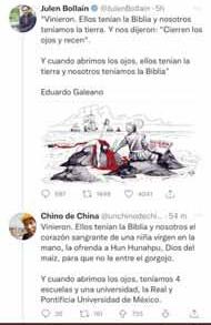 toria contra España lo representa hoy día López Obrador, presidente de México y perteneciente a las élites criollas, que ha puesto en valor esta visión sesgada de la herencia española, para tapar problemas de su país a los que no puede hacer frente. “Figuras como López Obrador reivindica unas culturas precolombinas con las que él no tiene nada que ver, y se trata de una estrategia también para ganarse a la población indígena”, apostilla Sergio Fernández. La historia de España, como la de todos los países, está llena de sombras, pero también de momentos brillantes; y no hizo nada que no pusieran en práctica otros imperios europeos, que han ganado la batalla de la imagen a nivel internacional. Su fallo fue creerse el inmenso bulo labrado por sus enemigos y asumirlo como condición propia. p