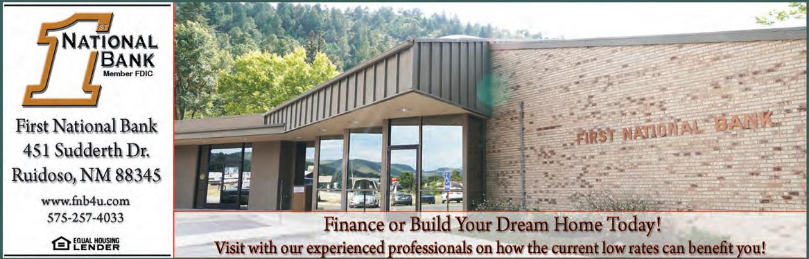 Tomison 806-777-2075 Rio Ruidoso Company Where the West is Bought and Sold THIS UNIQUE PROPERTY consists of 4 one bedroom/one bath bungalows with kitchenettes, 1 one bedroom/one bath cabin with full kitchen, 1 manufactured home with two bedrooms/two baths, detached two car garage, one storage building, one small building of office space and covered RV parking. There is a spectacular pool house with pool, full kitchen, one bath, game/living area and large covered deck. Four hot tubs. Granite counters throughout the property. This property is turnkey for nightly rentals. Perfect place to enjoy gatherings large or small! MLS#127822 $1,895,000 CUSTOM BUILT ADOBE HOME On 3 lots all with Carrizo Creek frontage. Granite countertops and saltillo tile throughout. Must see! MLS#128925 $599,000 SIERRA BLANCA VIEWS! Manufactured home with an oversized carport, storage shed and separate studio. Ready to make it your own special place! MLS#130157 $238,000 LOOKING FOR COMFORT IN THE MOUNTAINS? You’ve found it! This home offers the perfect blend of relaxation and convenience. Tucked away in a quiet area, this cozy retreat is only a stone’s throw away from Ruidoso’s amenities & attractions. Enjoy beautiful valley views on the deck or relax in the hot tub. Currently a nightly rental. This property is turnkey, fully furnished, stocked kitchen and linens. MLS#129996 $419,000 PRICE REDUCED RENTAL HISTORY CREEK FRONTAGE ALMOST HALF AN ACRE of beautiful Sierra Blanca and Capitan mountains views from this mostly level, easily buildable lot in Ruidoso NM. Come and get some of this! MLS#129609 $79,500 INVESTMENT OPPORTUNITY! See more listings at www.RioRuidosoCompany.com Manda Tomison, Qualifying Broker 1204 Mechem, Suite 18, Ruidoso, NM 88345 Toll Free: 866-505-3888 • Office: 575-258-3888 • info@riorc.com