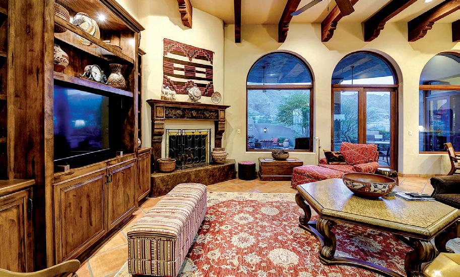 This exquisite Santa Barbara-style estate offers unparalleled elegance and breathtaking views. Step into the foyer and be captivated by walls of windows showcasing the stunning desert landscape. Exposed wood beams, corbels, and a custom masonry fireplace create a warm, inviting ambiance in the living room, seamlessly flowing into the formal dining area with doors that open for effortless indoor-outdoor entertaining. Spacious office with custom built-ins. Outdoors, a flagstone patio, soothing water feature, beehive fireplace, and lush landscaping.