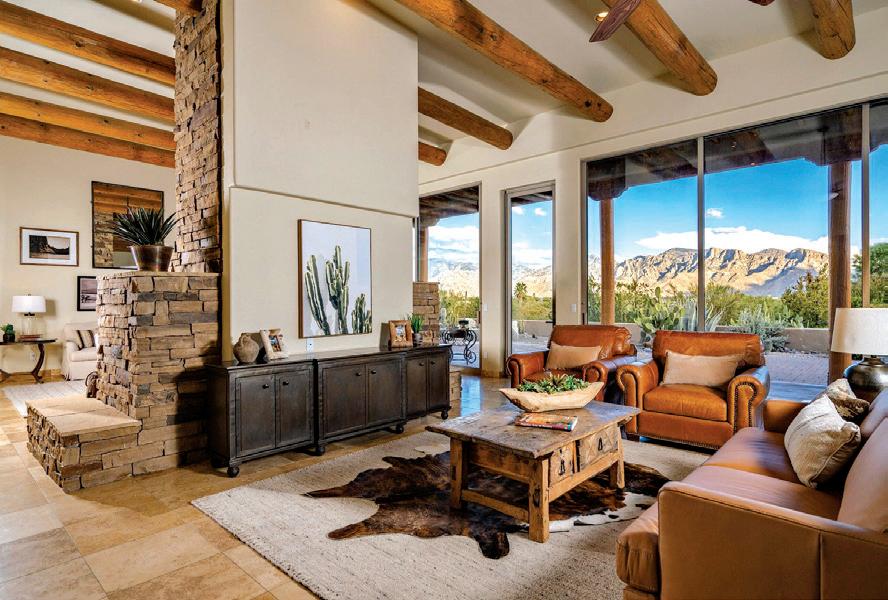 4,190 SF, 5 BR, 4 BA. A long, circular concrete driveway leads to a dramatic entry that opens to retractable sliding glass doors, seamlessly framing breathtaking views of the Santa Catalina Mountains and extending your living space outdoors. Inside, the great room captivates with soaring wood-beamed ceilings, a stacked-stone gas fireplace, and timeless natural stone floors. This custom residence offers unmatched privacy, classic design, and sensational views in every direction. Resort-style backyard with a pool and beautifully landscaped low-care grounds. Car enthusiasts will appreciate the oversized 1,700 SF 6-car/RV pull-through garage with dual front-and-back entry doors, a workshop and separate storage with custom built-ins.