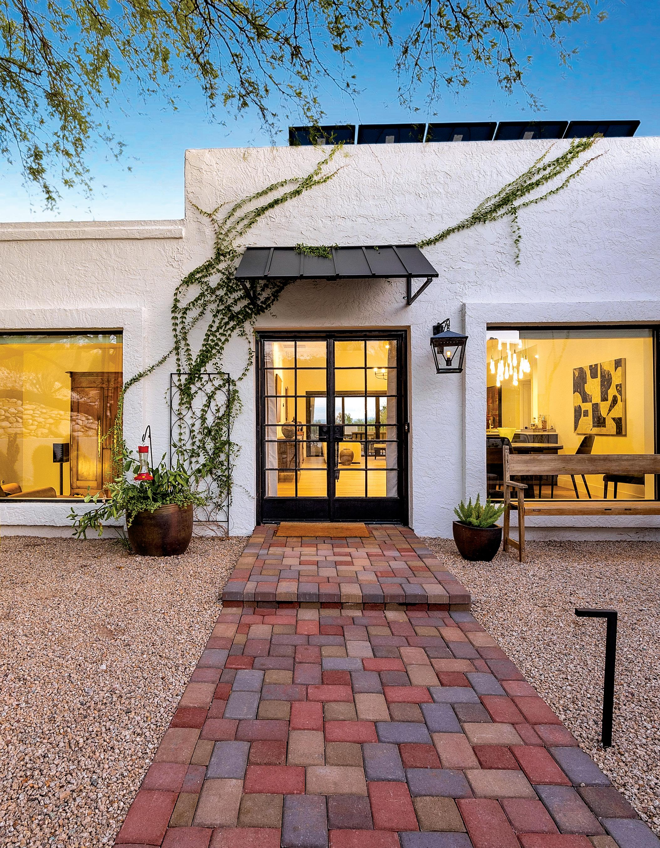 Set in one of Tucson’s most desirable neighborhoods, this thoughtfully renovated home blends high-end design with energy efficiency and incredible views. 3 BR, 2 BA, 1,834 SF. A bricked walkway leads to a private courtyard and striking paned-glass double front doors, setting the tone for the quality and style found throughout. Main living area presents open light filled living spaces with clerestory windows and elevated ceilings. The kitchen was fully reimagined with Diamond cabinets, quartz counters and high-end appliances. Owned solar panels.