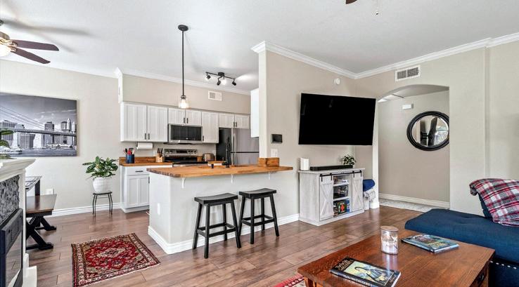 Rarely available and highly sought after, this beautifully remodeled home offers a redefined blend of luxury, comfort and location. 3 BR, 3 BA, 2,484 SF. Chef’s kitchen with Subzero and Wolfe appliances and a large island with seating. Warm wood-accented ceilings, two updated fireplaces, wet bar and more. Beautifully landscaped courtyard, mountain views and a peaceful backyard with an expansive patio. $1,185,000