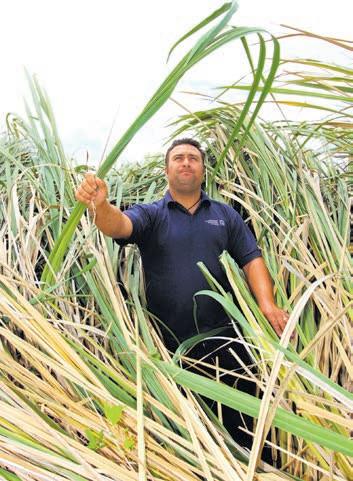 Curtis Harris, Northland Regional Council staff member with Manchurian rice grass veiny leaf and a thick midrib. Raupō has a bullrush