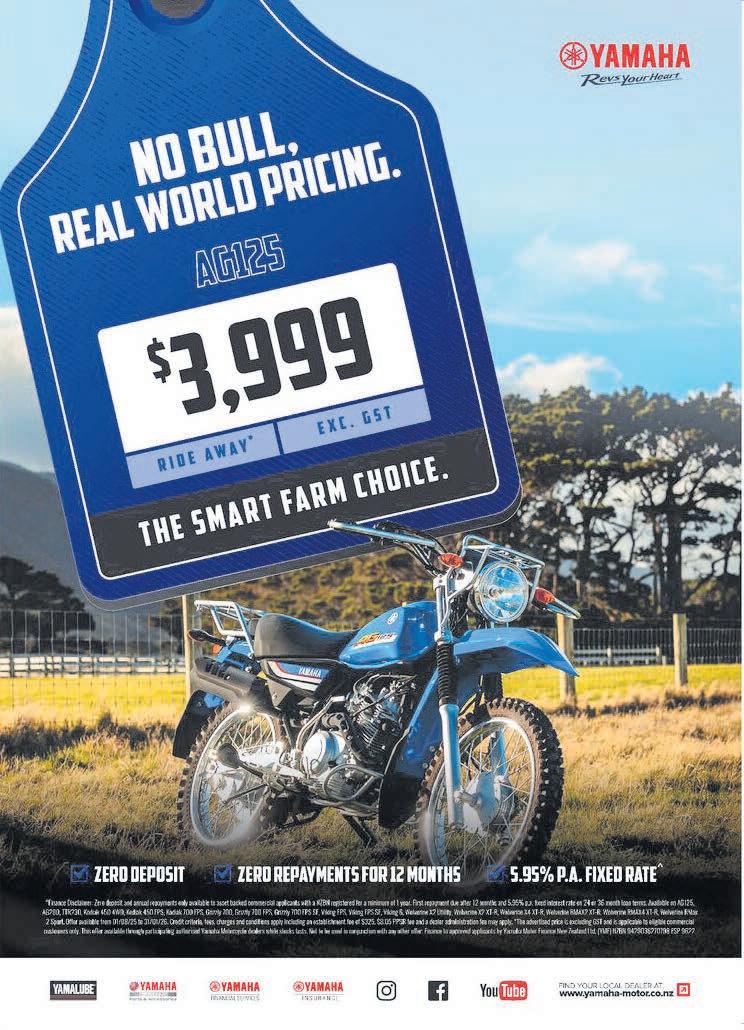 NEW YAMAHA FARM ATVs — 5.9% interest & 3 year warranty. Only at Rouse Motorcycles, King Street, Hikurangi — phone 0800 963 636 & Yamaha MC Whangarei. Ph 09 438 0804.