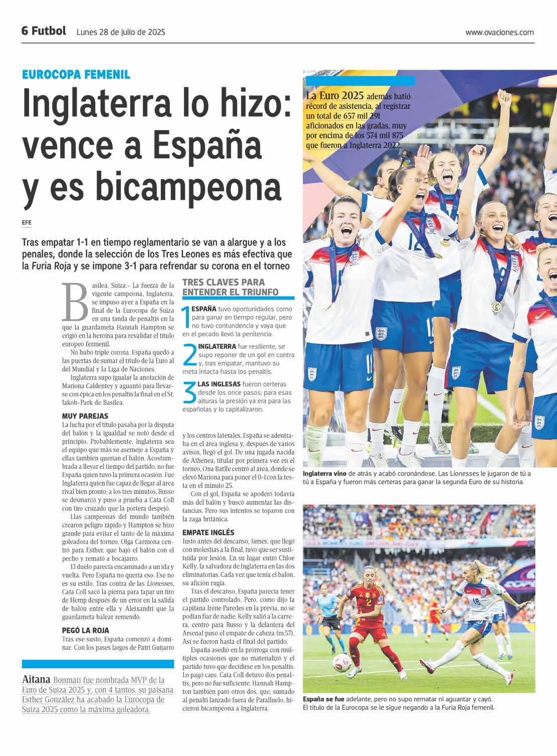 ● SUIZA. La fuerza de la vigente campeona, Inglaterra, se impuso este domingo a España en la Final de la Eurocopa de Suiza en una tanda de penaltis en la que la guardameta Hannah Hampton se erigió como la heroína para revalidar el título. OVACIONES